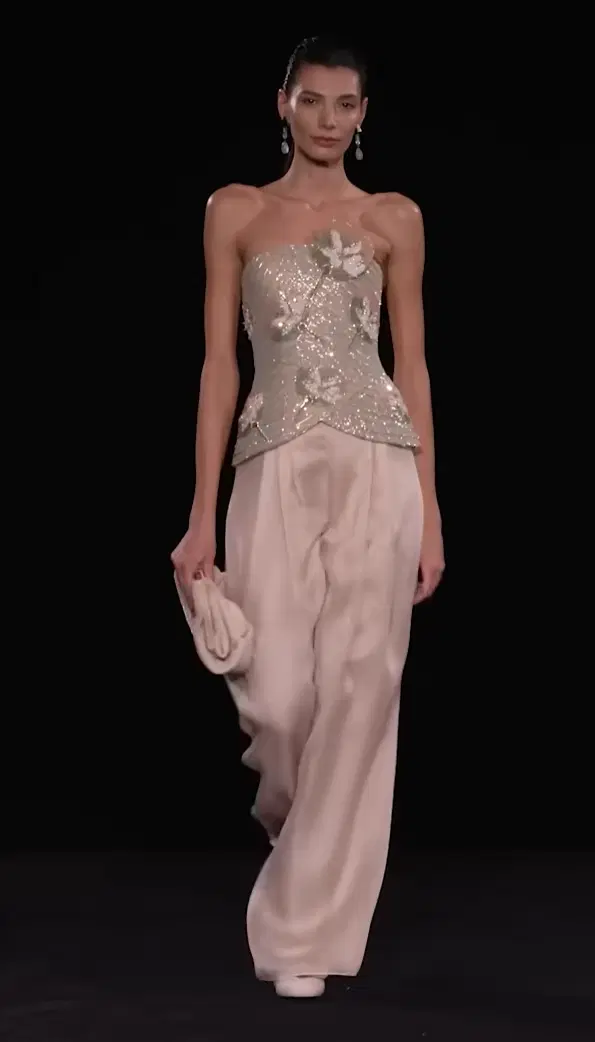 Essa evolução se torna clara quando comparada a coleções anteriores. A proposta aposta em brilho, transparências, tecidos acetinados e silhuetas bem definidas, compondo uma coleção que transita entre ternos femininos, vestidos de festa e combinações de corset com calça.
