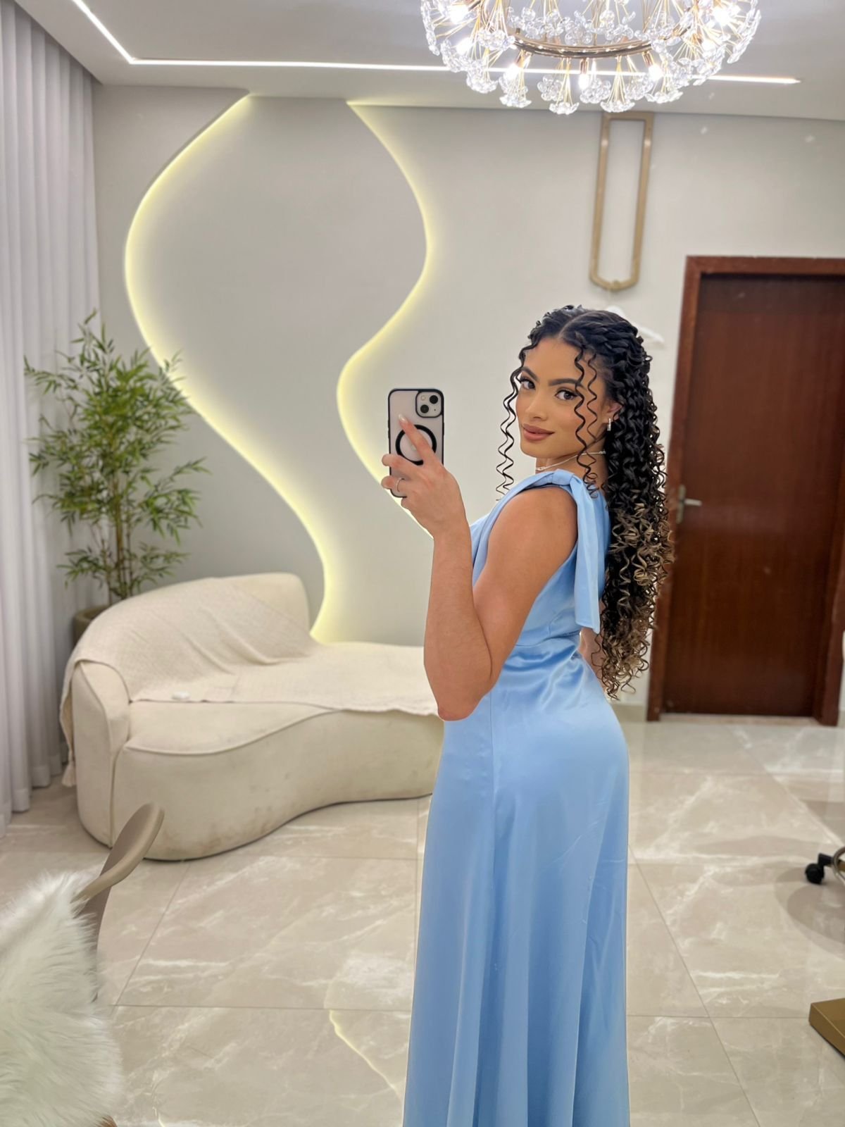 O tom azul claro traz frescor e suavidade ao visual, enquanto o desenho limpo permite que a forma e o caimento conduzam a leitura da peça.