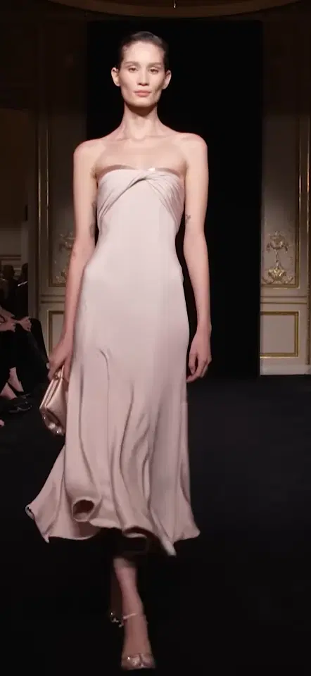 O que se viu nas passarelas foi uma resposta clara ao excesso de contenção dos últimos anos. A maioria das coleções apresentou arquiteturas de silhueta bem definidas, volumes controlados, transparências e sobreposições cuidadosamente construídas. As cores surgiram em tons diluídos como rosados suaves, azulados e verdes claros.